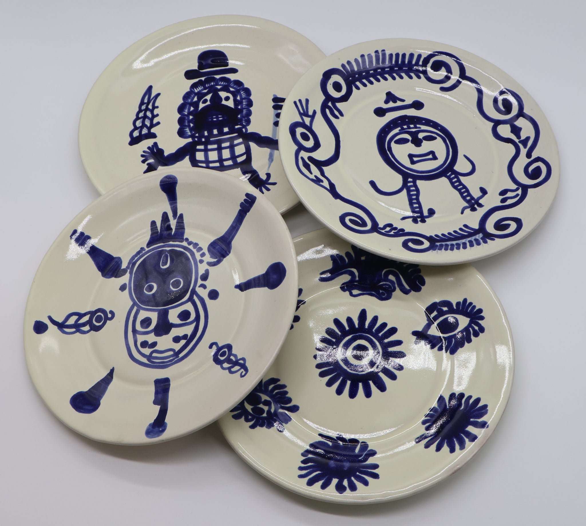 Original design: Solar faces, tribal patterns, and symbolic motifs reinterpreted in cobalt blue on natural ceramic.
