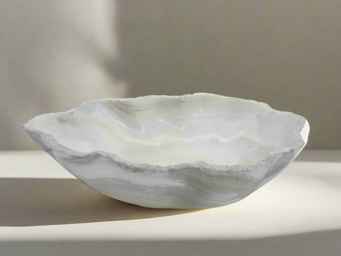 Sculpted by hand from natural marble and onyx, this bowl highlights the beauty of Mexico’s stonecraft traditions. Each piece is entirely unique, with organic veins and tones formed over millions of years, making no two alike. Its smooth finish and timeless design allow it to serve beautifully as a fruit bowl, a catchall, or a standalone decorative accent. Simple yet sophisticated, it brings natural elegance and a touch of modern artisanal craftsmanship to any space.