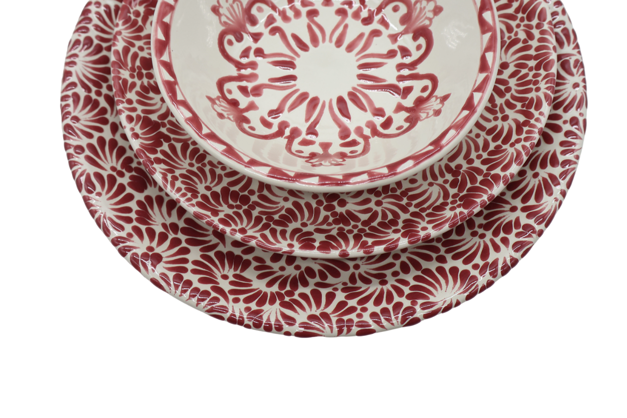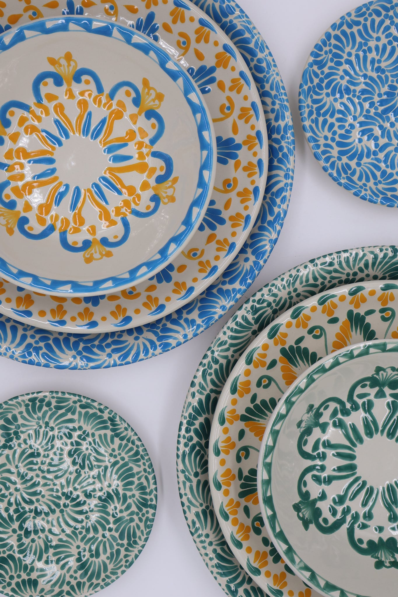This table setting is a testament to the artisanal talent of Puebla, handcrafted using Talavera Poblana techniques that give each plate a unique and distinctive mark. Each piece serves both as a functional plate for dining and as a decorative item that exudes elegance and uniqueness.